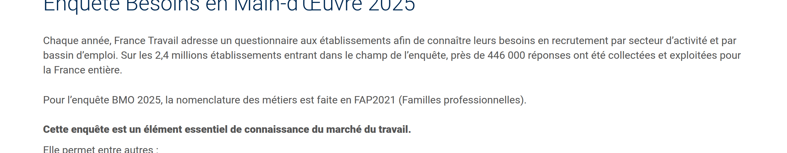 C'est une enquête sur les "besoins en main d'œuvre." Elle est une initiative de France Travail réalisée avec l'ensemble des directions Régionales et le concours du CREDOC qui est le centre de recherche pour l'étude et l'observation des conditions de vie. Chaque année France Travail adresse un questionnaire aux établissements afin de connaitre leurs besoins en recrutement par secteur d'activité et par bassin d'emploi. Cette enquête est un élément essentiel de connaissance du marché du travail ,elle permet entre autres :
