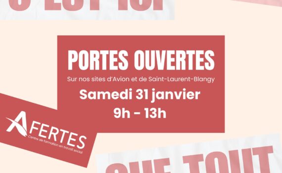 Portes ouvertes à l’AFERTES Tu cherches une formation dans le travail social ? Viens découvrir l’AFERTES et trouve celle qui te correspond. Au programme : Visite de nos locaux Rencontre avec notre équipe Échanges avec nos étudiants Conseils personnalisés sur ton projet de formation Quand ? Samedi 31 janvier De 9h00 à 13h00 Sur nos établissements d’Avion et de Saint-Laurent-Blangy Une occasion idéale pour poser toutes tes questions et concrétiser ton projet. Infos & contact : accueil@afertes.org 03 21 60 40 00