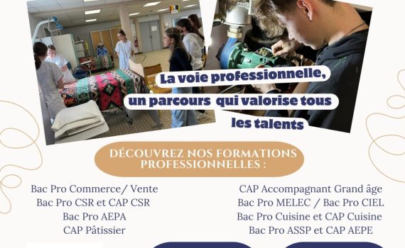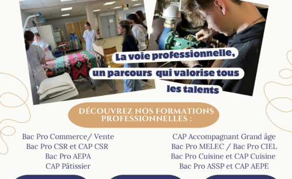 Vous vous interrogez sur la voie professionnelle après le collège ? Nos ateliers découverte, ouverts aux élèves de Quatrième / Troisième, permettent de mieux comprendre les formations, les métiers et les talents de chacun. 3 infos sur nos Ateliers Découvertes qui reviennent à partir du mercredi 11 février 2026 à 9h : – La voie professionnelle est un parcours qui valorise tous les talents. – On peut obtenir son diplôme en étant apprenti, en alternance dans une entreprise près de chez soi. – Quelles formations y découvrir ? Le Bac Pro Commerce et Vente, le Bac Pro CSR, le CAP […]