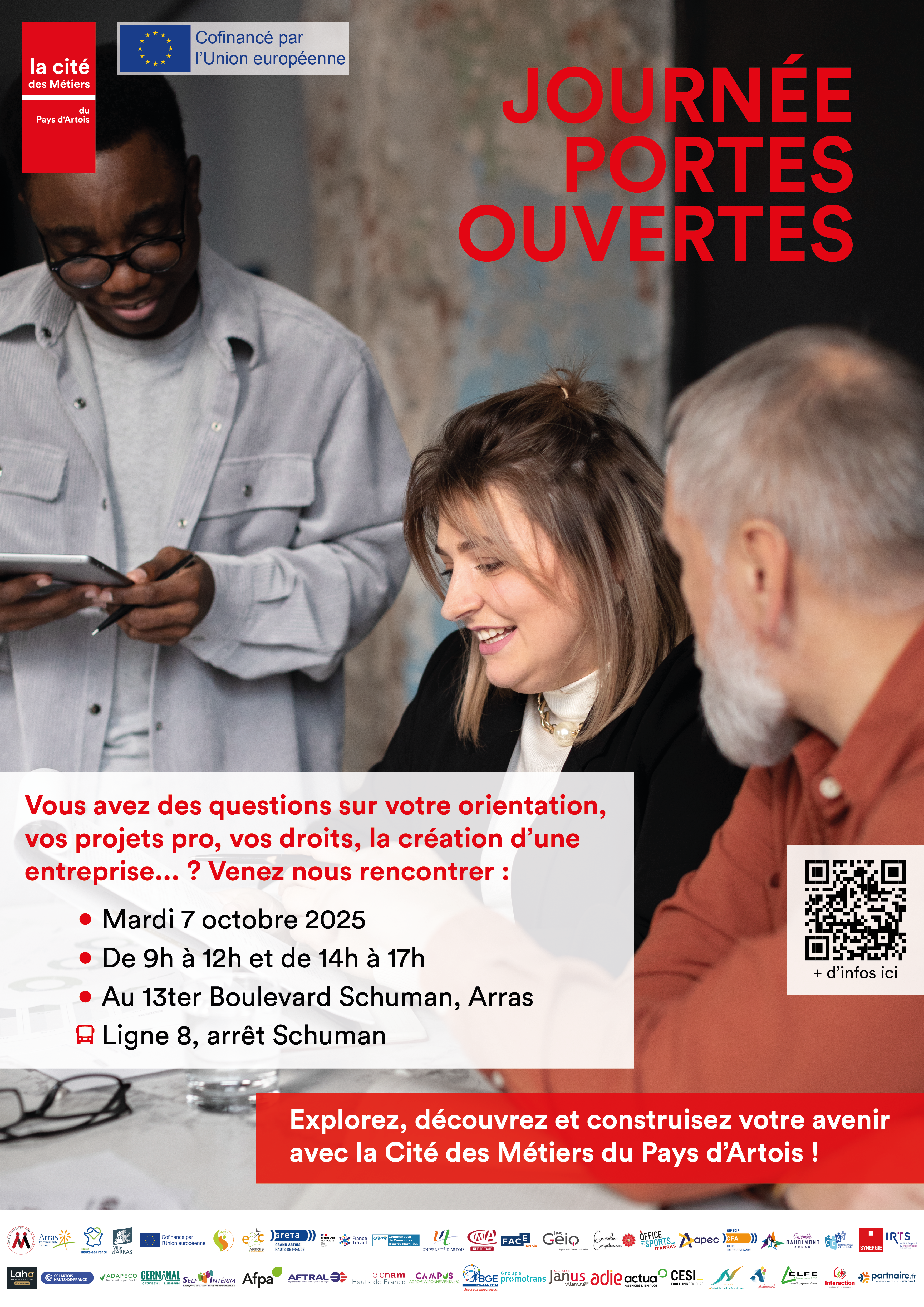 Le Proch’Info Formation d’Arras, porté par la Maison de l’Emploi et des Métiers, et en lien avec la Cité des Métiers du Pays d’Artois ouvre ses portes le 09 octobre de 10h à 16h en non-stop ! Que vous soyez demandeur d’emploi, salarié, chef d’entreprise, en réflexion sur votre avenir professionnel… Cette journée dédiée à la formation est faite pour vous. Lieu : 13 Ter boulevard Schuman à Arras Horaires : 10h – 16h non-stop et sans inscription Pour retrouver le programme, scannez le QR Code présent sur l’affiche.